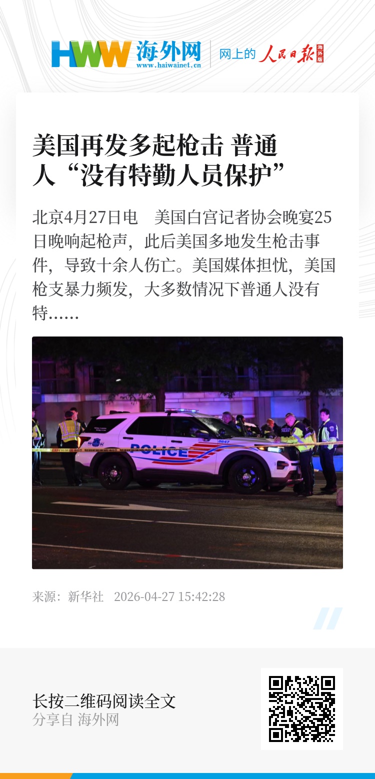 新华社北京4月27日电 美国白宫记者协会晚宴25日晚响起枪声,此后美国多地发生枪击事件,导致十余人伤亡。美国媒体担忧,美国枪支暴力频发,大多数情况下普通人没有特勤人员保护,会“更危险”“更无助”。