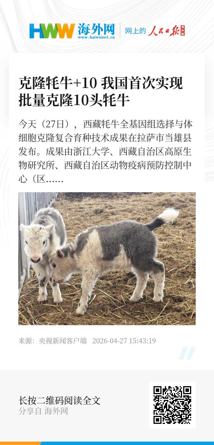 2026年3月25日至4月5日,第二批次克隆牦牛首次实现了10头批量受孕并全部自然顺产,新技术顺利通过了从“1-10”小规模应用的实践验证,为下一步可量产、可推广的产业化目标提供了解决方案。