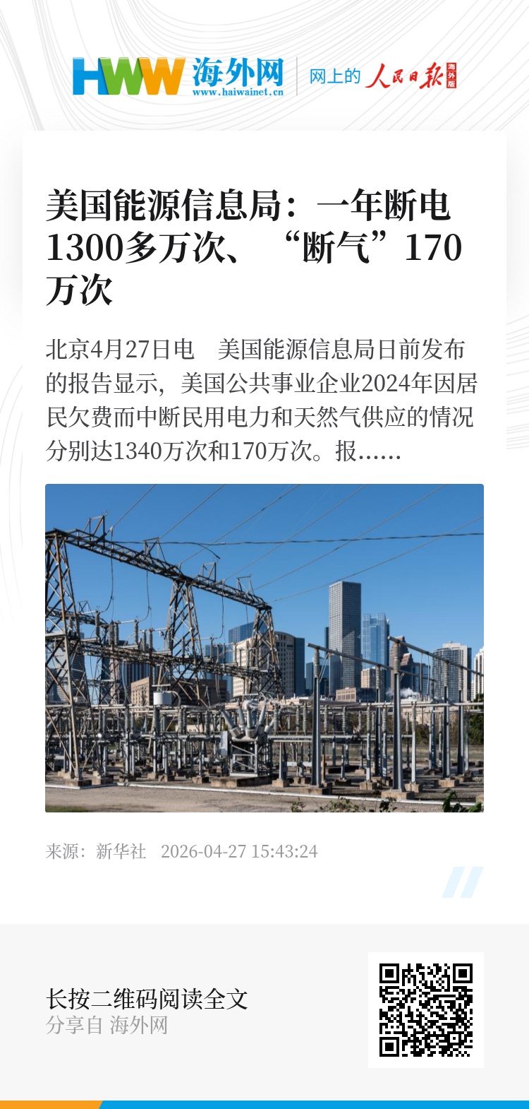 新华社北京4月27日电 美国能源信息局日前发布的报告显示,美国公共事业企业2024年因居民欠费而中断民用电力和天然气供应的情况分别达1340万次和170万次。