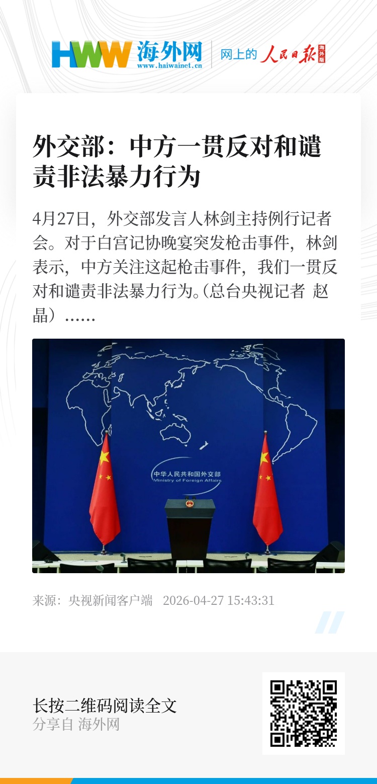 4月27日,外交部发言人林剑主持例行记者会。对于白宫记协晚宴突发枪击事件,林剑表示,中方关注这起枪击事件,我们一贯反对和谴责非法暴力行为。