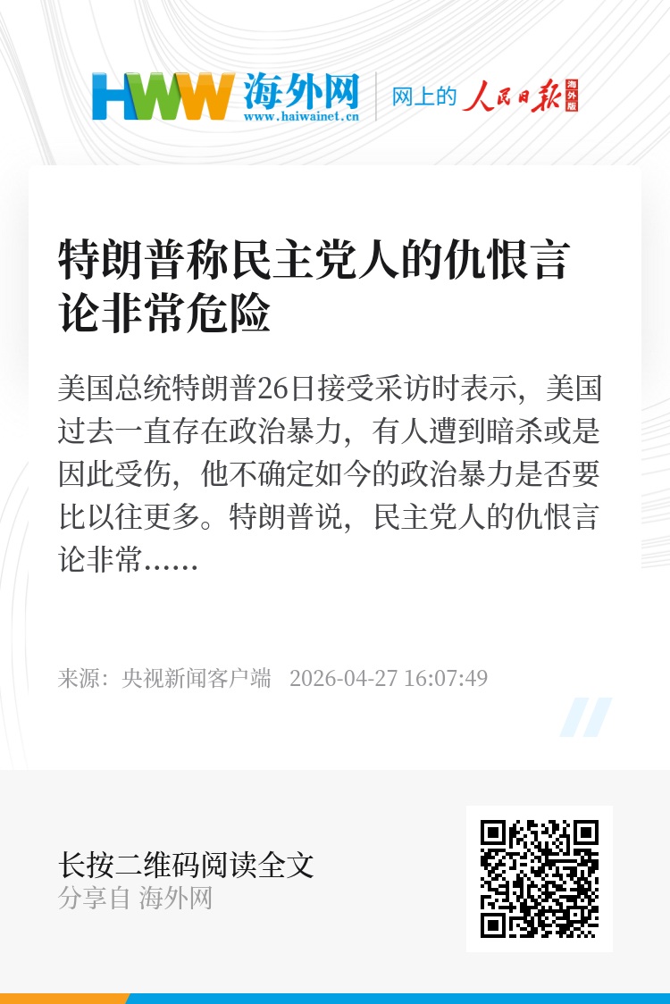 美国总统特朗普26日接受采访时表示,美国过去一直存在政治暴力,有人遭到暗杀或是因此受伤,他不确定如今的政治暴力是否要比以往更多。