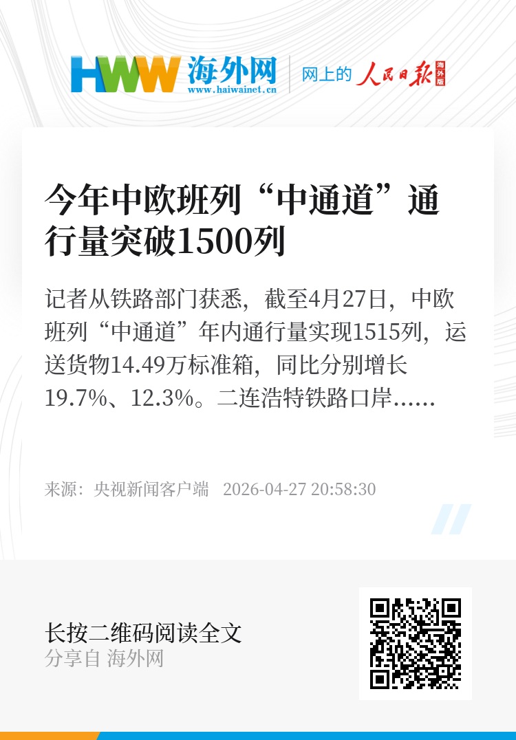 记者从铁路部门获悉,截至4月27日,中欧班列“中通道”年内通行量实现1515列,运送货物14.49万标准箱,同比分别增长19.7%、12.3%。