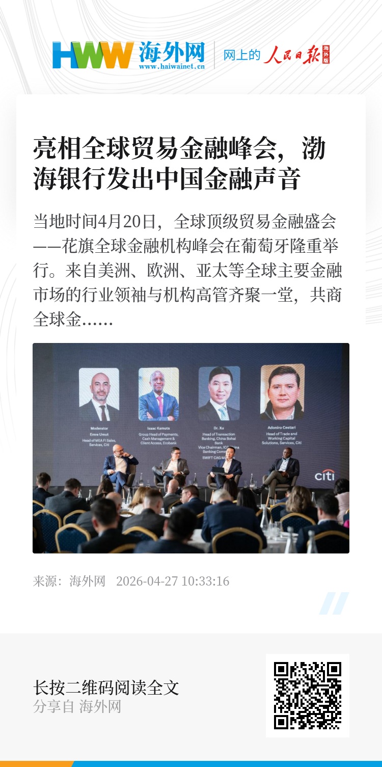 从葡萄牙的全球峰会到中国的开放实践,渤海银行作为首位中国代表登上花旗全球金融机构峰会,不仅是对该行专业能力与行业地位的高度认可,更是中国金融业提升国际话语权、深度参与全球金融治理、服务国家对外开放大局的生动缩影。站在新的历史起点,渤海银行将始终坚守金融报国、金融为民初心,坚定不移服务国家战略,持续提升全球化、数字化、专业化服务水平,全力护航中国企业高质量出海,助力畅通国内国际双循环,携手全球同业共筑数字贸易新生态,为推进中国式现代化、建设开放型世界经济、促进全球互联互通作出新的更大贡献。