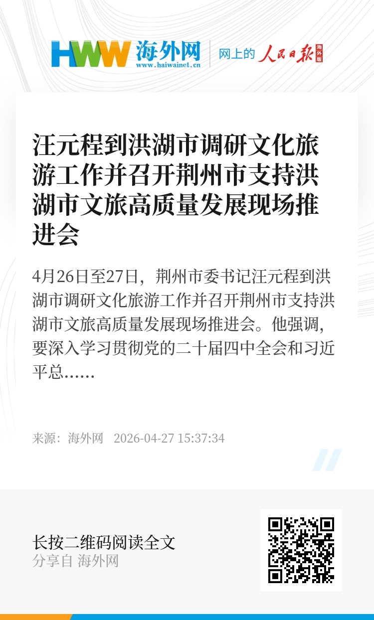 4月26日至27日,荆州市委书记汪元程到洪湖市调研文化旅游工作并召开荆州市支持洪湖市文旅高质量发展现场推进会。他强调,要深入学习贯彻党的二十届四中全会和习近平总书记考察湖北重要讲话精神,认真落实省委书记王忠林调研荆州讲话要求,坚持以文塑旅、以旅彰文,精准策划高品质文旅活动、打磨优质文旅产品,加快把洪湖市打造成为全国知名红色文化旅游目的地,为加快“两个推动”赋能添彩。