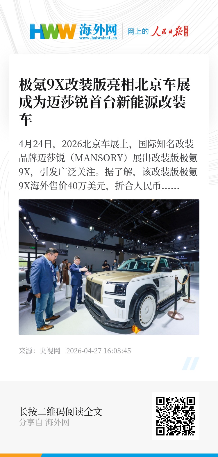 4月24日,2026北京车展上,国际知名改装品牌迈莎锐(MANSORY)展出改装版极氪9X,引发广泛关注。
