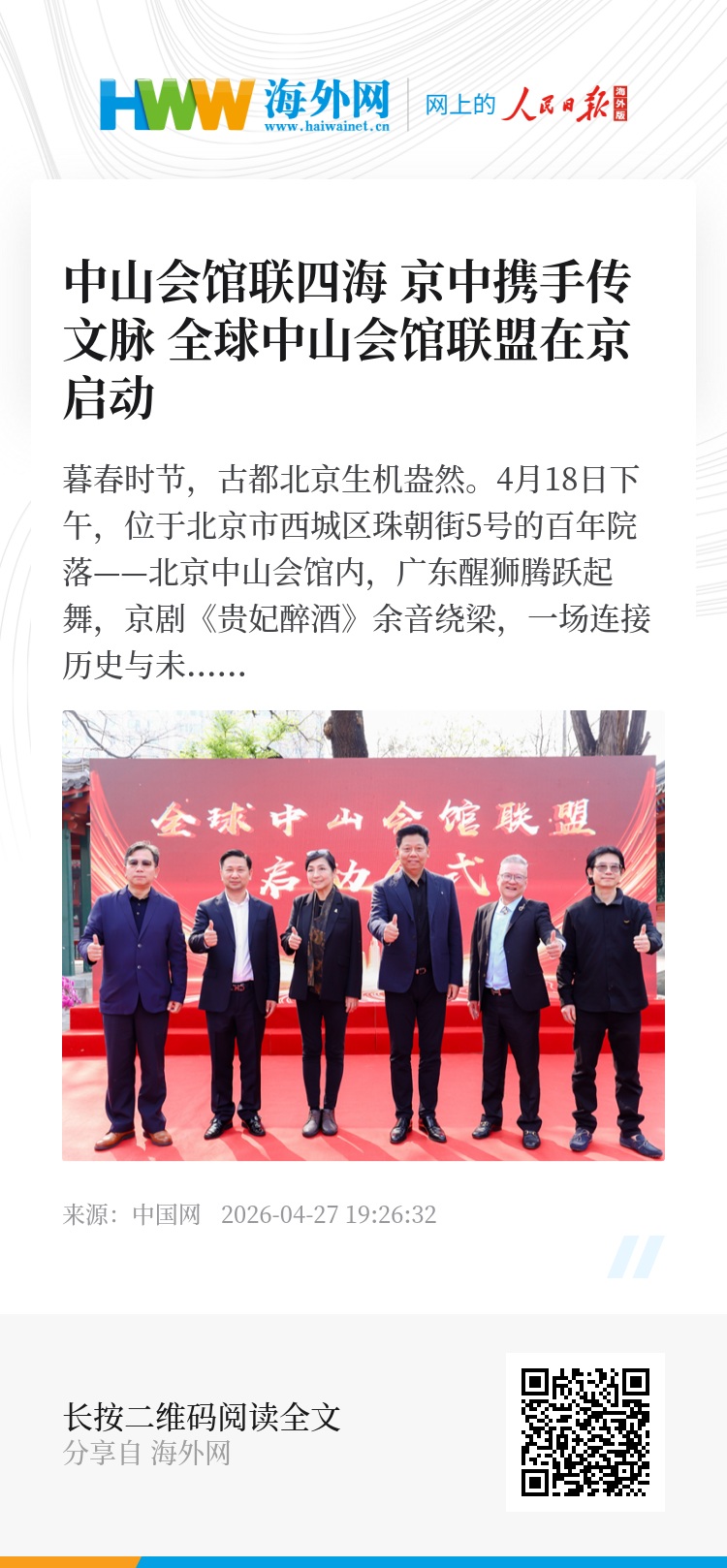 暮春时节,古都北京生机盎然。4月18日下午,位于北京市西城区珠朝街5号的百年院落——北京中山会馆内,广东醒狮腾跃起舞,京剧《贵妃醉酒》余音绕梁,一场连接历史与未来的文化盛典在此隆重举行。全球76家中山会馆代表跨越山海、齐聚京城,在孙中山先生诞辰 160周年之际共同见证“全球中山会馆联盟”正式启动。这标志着全球76家中山会馆首次实现制度化、平台化的全球联结,是海内外中华儿女赓续先辈精神、守护共同记忆的历史性时刻,也是新时代推动中华优秀传统文化创造性转化、创新性发展的一次生动实践。