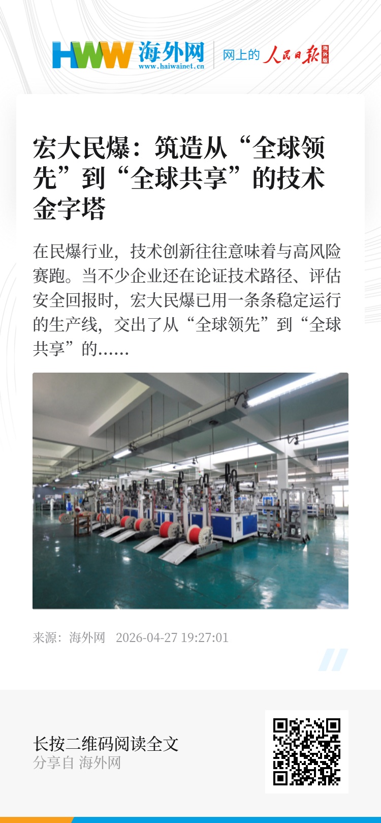 在民爆行业,技术创新往往意味着与高风险赛跑。当不少企业还在论证技术路径、评估安全回报时,宏大民爆已用一条条稳定运行的生产线,交出了从“全球领先”到“全球共享”的实战答卷。