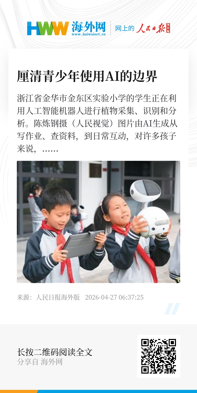 说到底,青少年与AI之间,不应是简单隔绝,也不能是无边界拥抱。更可取的路径是在接触中引导,在使用中立规,让AI成为支持成长的工具,而不是替代成长的捷径。所以真正重要的问题是如何划定边界、形成规范,让他们学会与AI相处,而不是被AI牵着走。