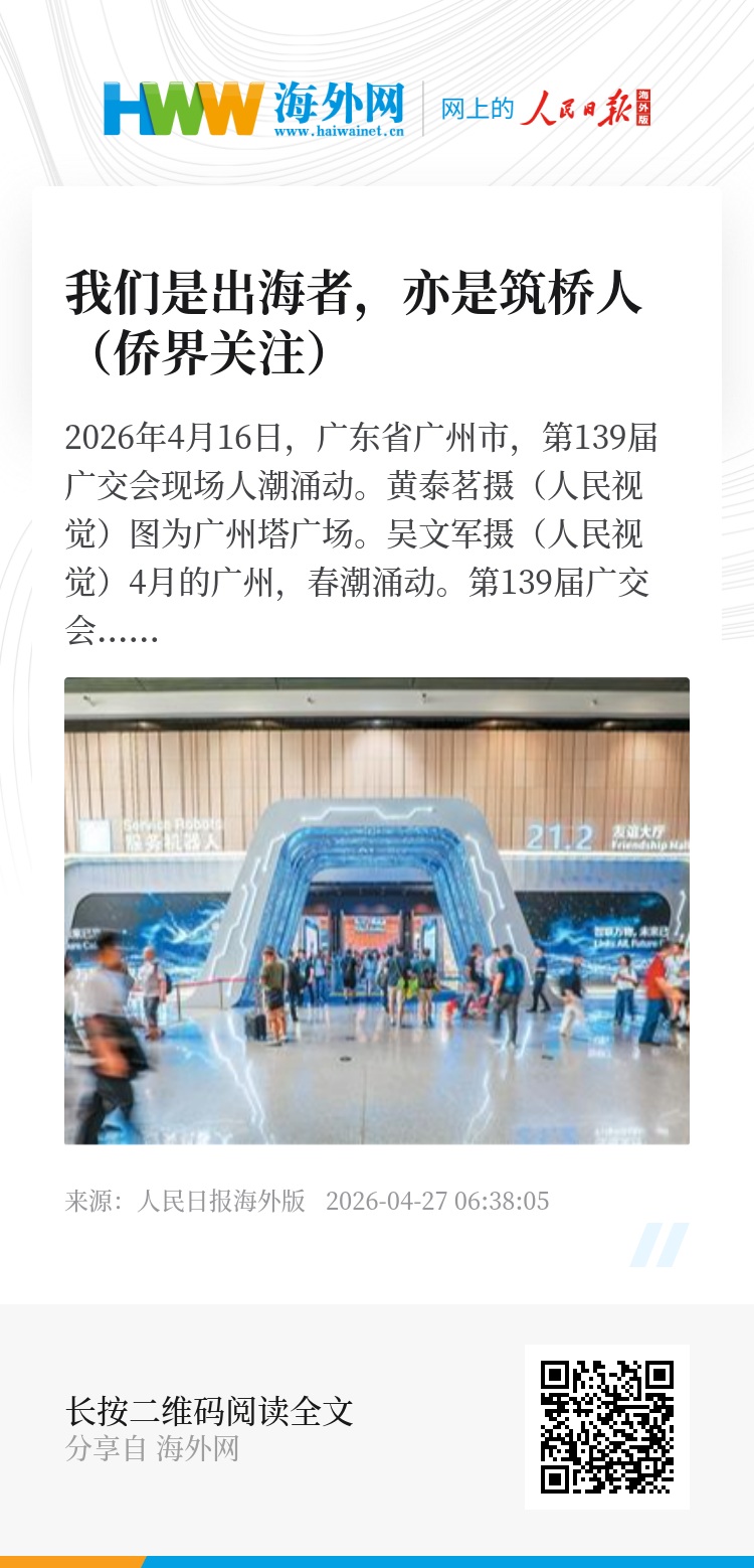 “帮助家乡企业‘走出去’,让更多海外华侨华人关注广东,这是很值得做的一件事。”龙昊说,“未来,我希望继续发挥桥梁作用,推动更精准、更务实的合作,帮助更多广东企业少走弯路、更稳出海。”(本报记者 林子涵)
