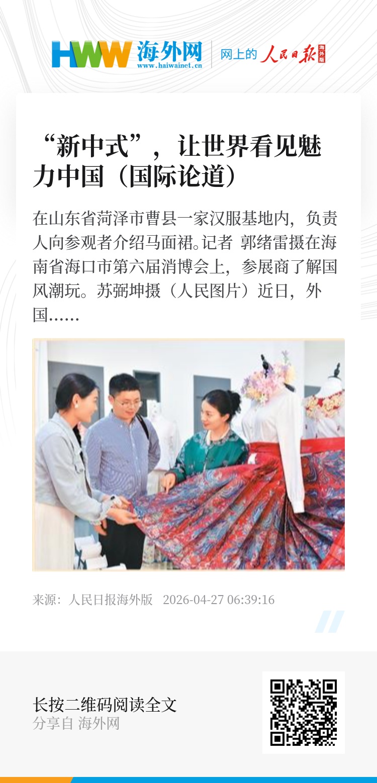 俄罗斯卫星通讯社认为,“新中式”风潮不仅仅是一种时尚趋势,更是通过将传统与现代相结合,展现了中国人对自身文化的认同与自信。