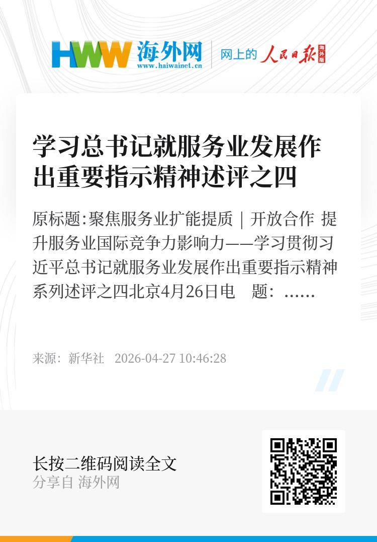新华社北京4月26日电 题:开放合作 提升服务业国际竞争力影响力——学习贯彻习近平总书记就服务业发展作出重要指示精神系列述评之四