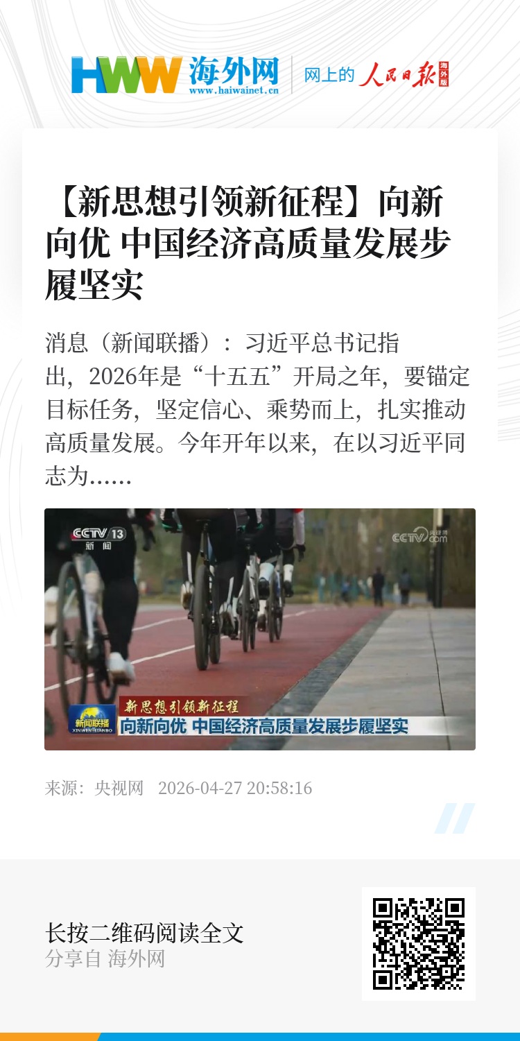 央视网消息(新闻联播):习近平总书记指出,2026年是“十五五”开局之年,要锚定目标任务,坚定信心、乘势而上,扎实推动高质量发展。今年开年以来,在以习近平同志为核心的党中央坚强领导下,宏观政策靠前发力、应对有力,高质量发展新动能不断累积增强,推动经济运行实现良好开局。