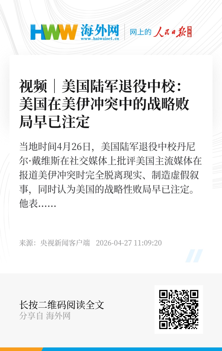 当地时间4月26日,美国陆军退役中校丹尼尔·戴维斯在社交媒体上批评美国主流媒体在报道美伊冲突时完全脱离现实、制造虚假叙事,同时认为美国的战略性败局早已注定。他表示,冲突继续拖下去只会让代价无限放大,完全不符合美国的利益。这场冲突过后,美国的国际地位只会变得更糟。