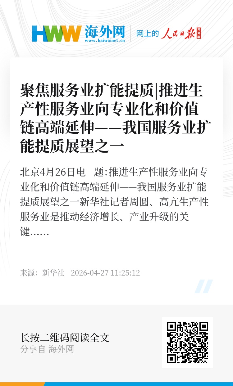 新华社北京4月26日电 题:推进生产性服务业向专业化和价值链高端延伸——我国服务业扩能提质展望之一