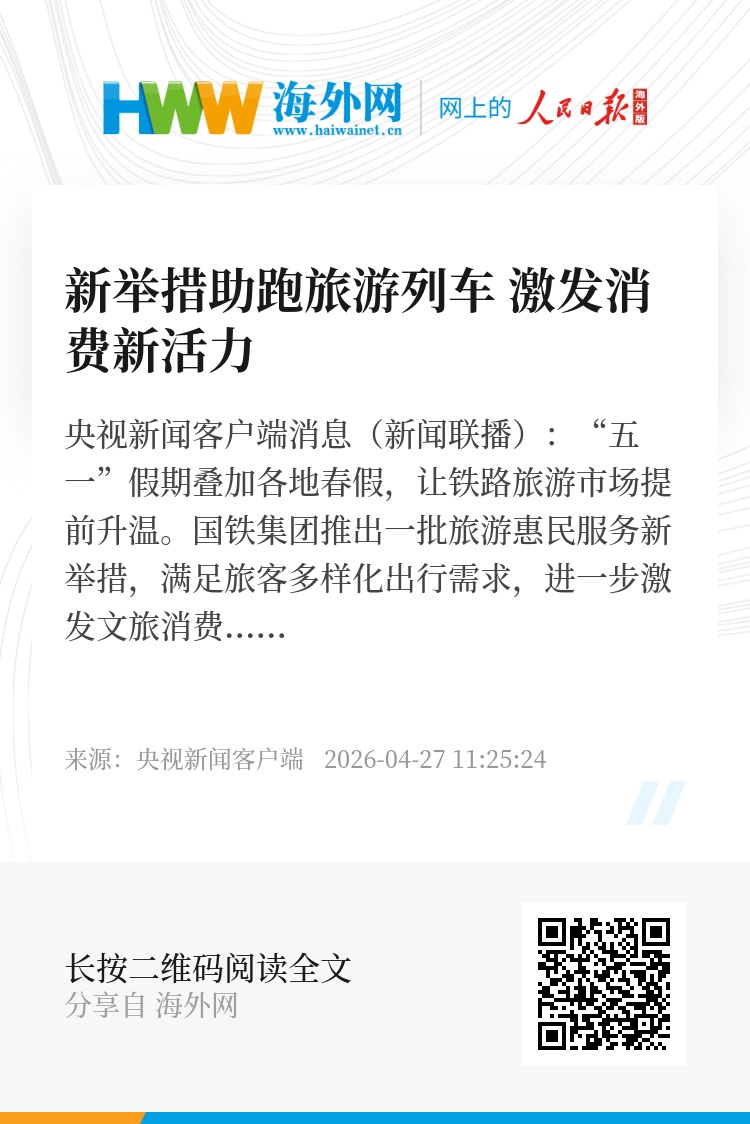 央视新闻客户端消息(新闻联播):“五一”假期叠加各地春假,让铁路旅游市场提前升温。国铁集团推出一批旅游惠民服务新举措,满足旅客多样化出行需求,进一步激发文旅消费新活力。