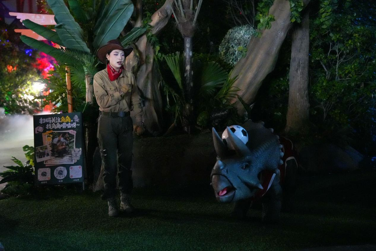 中华恐龙园工作人员与恐龙“角角”在互动(光明网记者 王文韬摄)