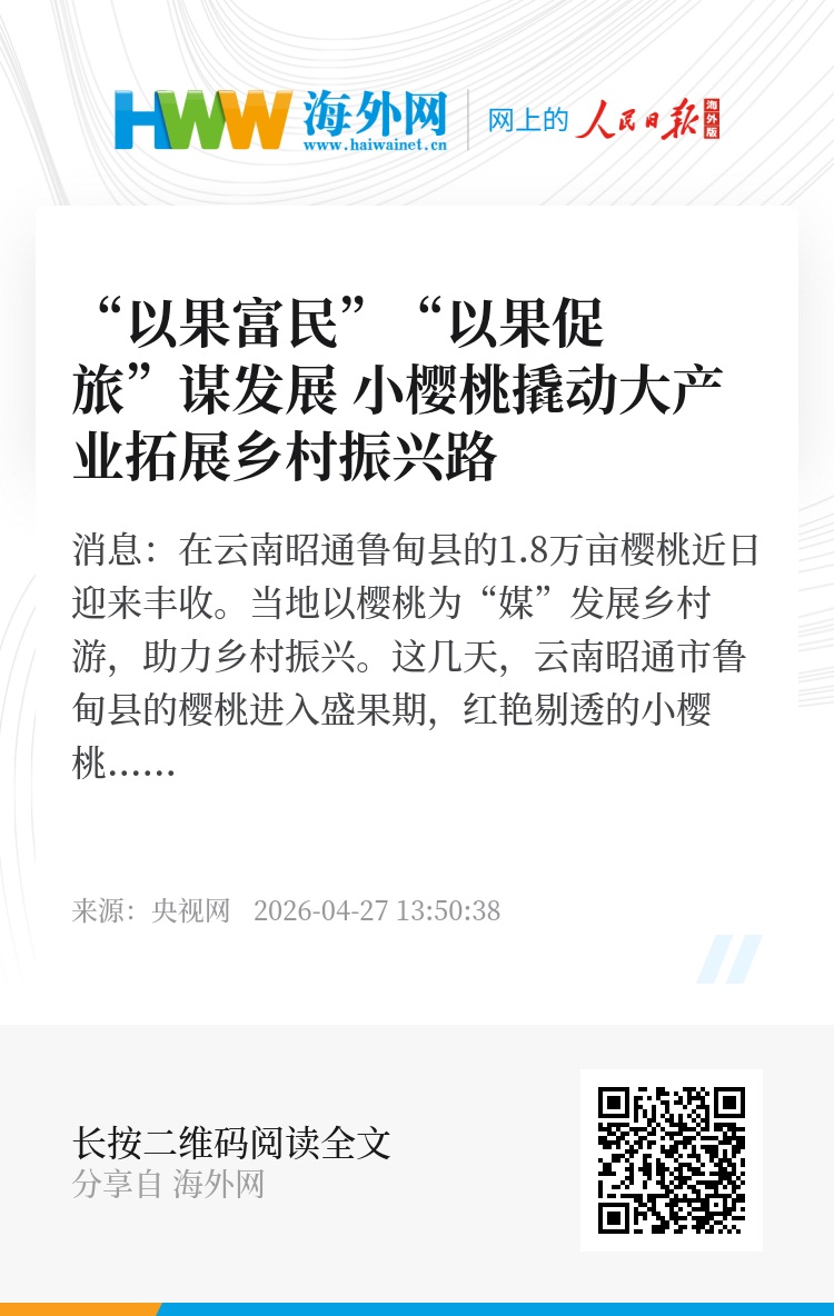 央视网消息:在云南昭通鲁甸县的1.8万亩樱桃近日迎来丰收。当地以樱桃为“媒”发展乡村游,助力乡村振兴。