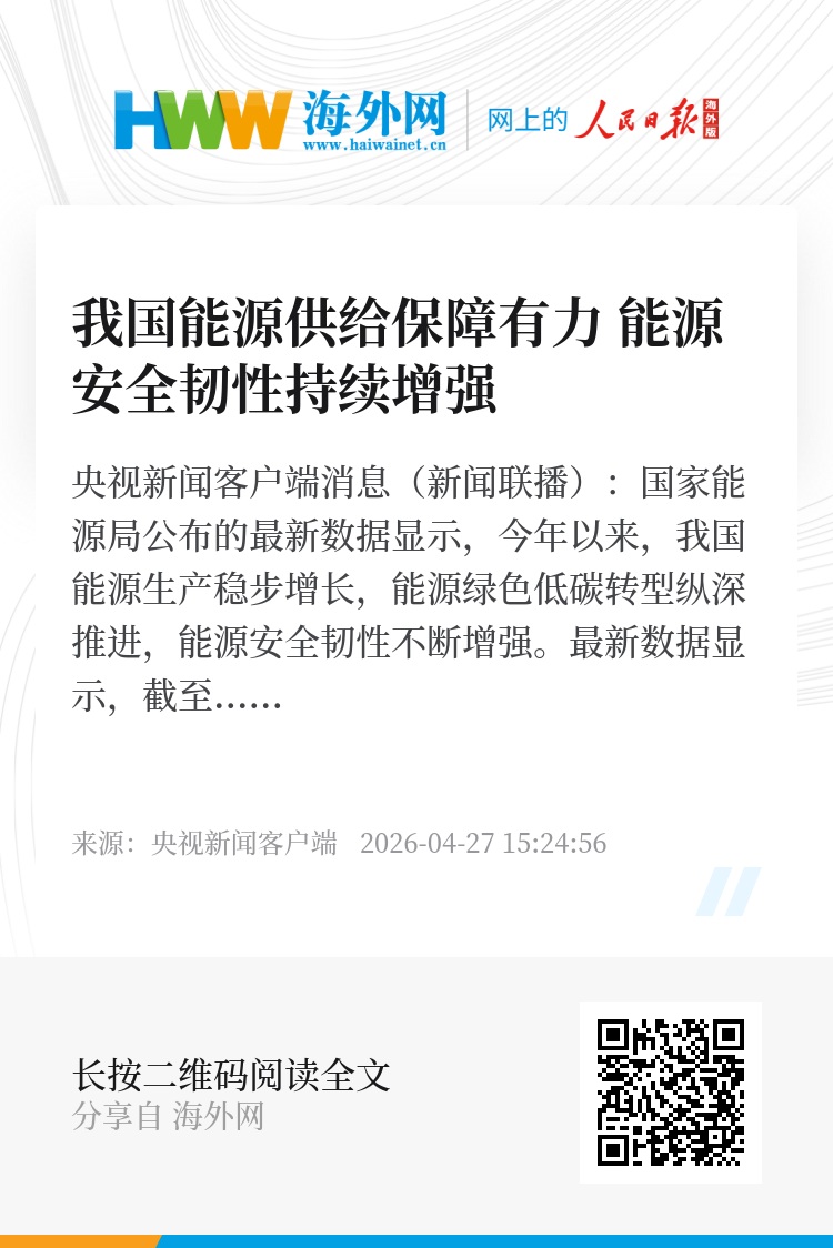 央视新闻客户端消息(新闻联播):国家能源局公布的最新数据显示,今年以来,我国能源生产稳步增长,能源绿色低碳转型纵深推进,能源安全韧性不断增强。