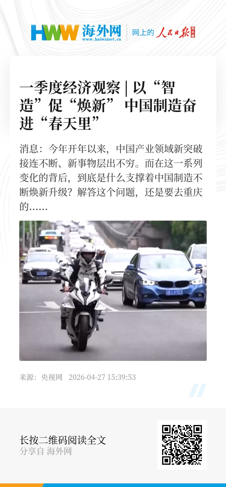 其实,重庆摩托车背后的故事只是今年一季度中国产业焕新的一个缩影。开年以来,从传统制造到新兴赛道,依托完整产业链实现的实打实突破,正在全国各地接连落地。