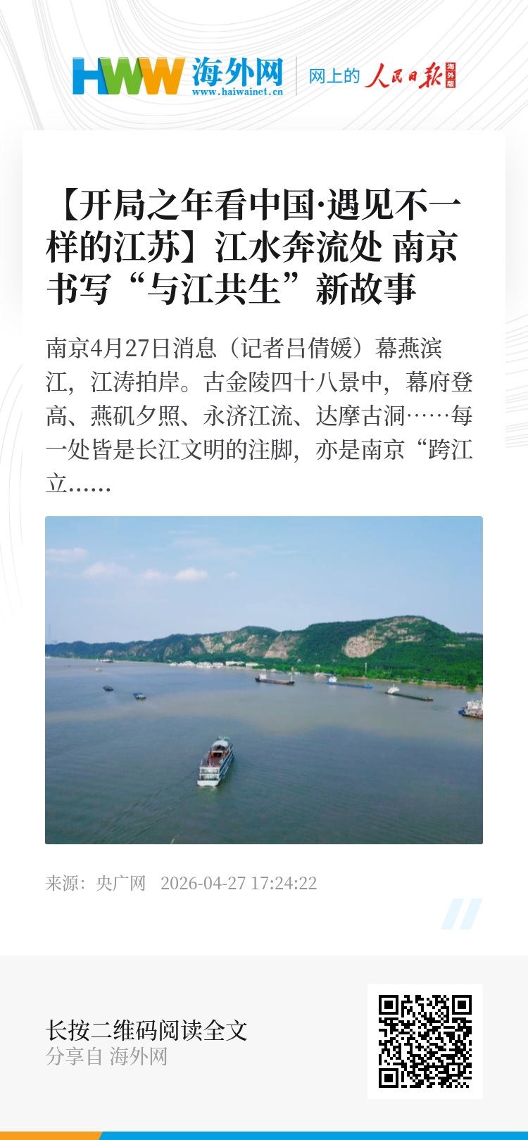 央广网南京4月27日消息(记者吕倩媛)幕燕滨江,江涛拍岸。古金陵四十八景中,幕府登高、燕矶夕照、永济江流、达摩古洞……每一处皆是长江文明的注脚,亦是南京“跨江立城”的烙印。“十五五”规划纲要强调,坚持共抓大保护、不搞大开发,坚持生态优先、绿色发展,持续推进长江经济带高质量发展。近日,“开局之年看中国·遇见不一样的江苏”网络主题宣传活动走进南京,看这座跨江发展的城市,如何在江水奔流处绘出文脉新卷。