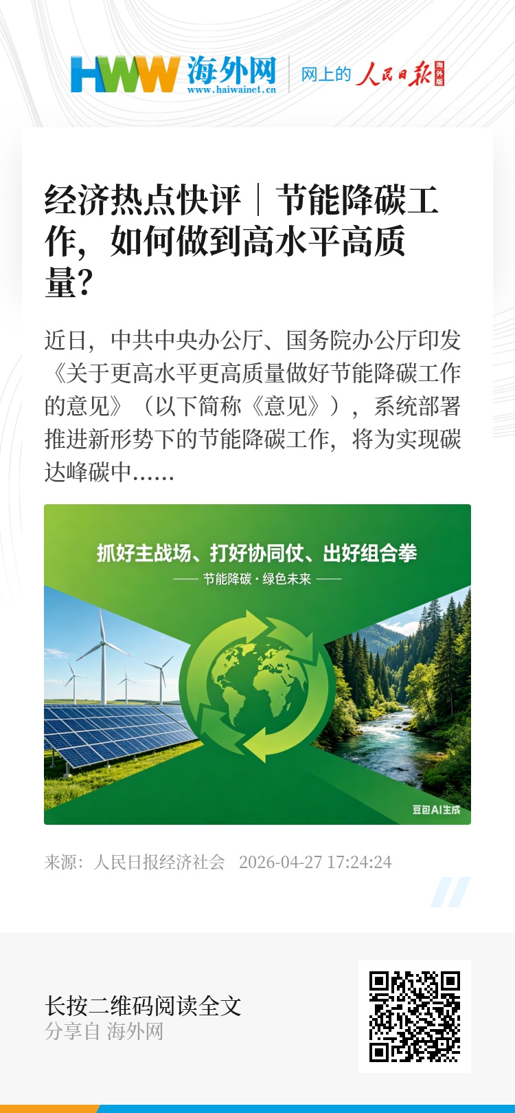 应对气候变化、推动可持续发展关系人类前途和未来。以《意见》出台为新起点,以攻坚之姿,持恒久之力,更高水平更高质量做好节能降碳,才能打好实现碳达峰碳中和这场大仗硬仗。