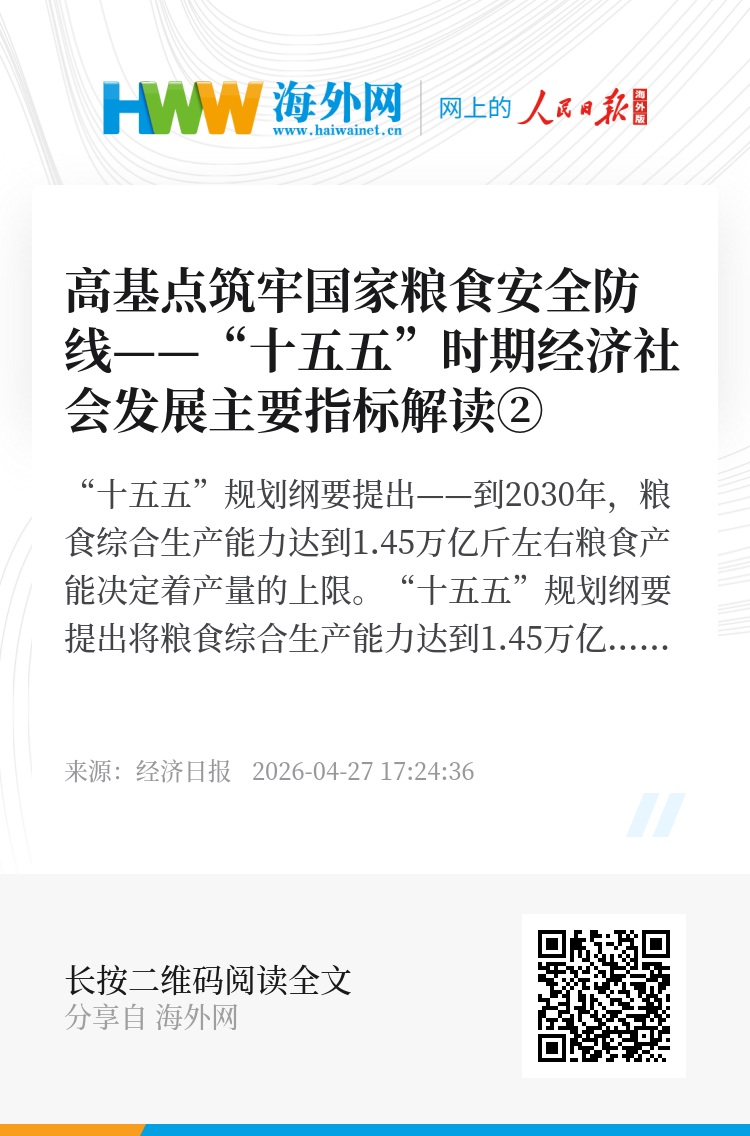 粮食产能决定着产量的上限。“十五五”规划纲要提出将粮食综合生产能力达到1.45万亿斤左右作为约束性指标。这一目标背后,承载着14亿多人的饭碗安全,也牵动着国家发展全局。“实现这个目标,要加快推进农业现代化、农民现代化。”华中农业大学乡村振兴研究院院长宋洪远说。