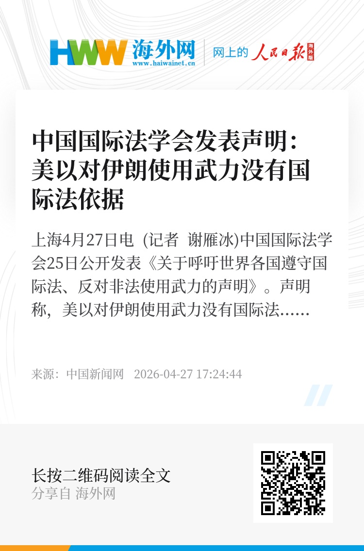 中新网上海4月27日电 (记者 谢雁冰)中国国际法学会25日公开发表《关于呼吁世界各国遵守国际法、反对非法使用武力的声明》。声明称,美以对伊朗使用武力没有国际法依据,是严重的不法行为,应当立刻停止。