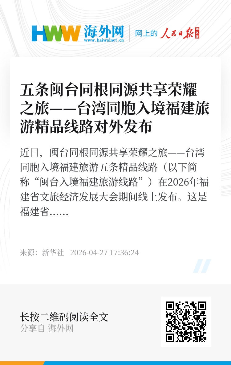 近日,闽台同根同源共享荣耀之旅——台湾同胞入境福建旅游五条精品线路(以下简称“闽台入境福建旅游线路”)在2026年福建省文旅经济发展大会期间线上发布。这是福建省文化和旅游厅贯彻落实4月12日中央台办受权发布十项促进两岸交流合作政策措施的具体举措。