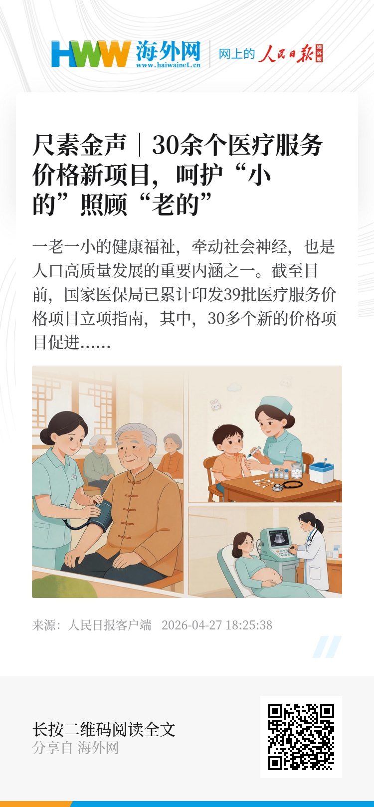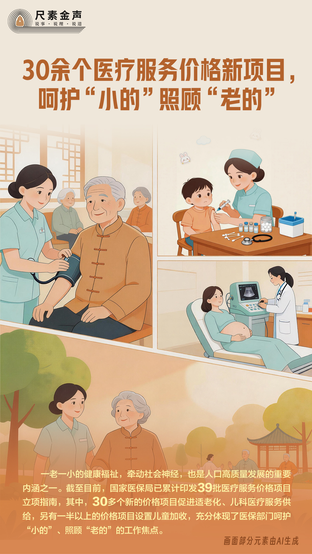 一老一小的健康福祉,牵动社会神经,也是人口高质量发展的重要内涵之一。截至目前,国家医保局已累计印发39批医疗服务价格项目立项指南,其中,30多个新的价格项目促进适老化、儿科医疗服务供给,另有一半以上的价格项目设置儿童加收,充分体现了医保部门呵护“小的”、照顾“老的”的工作焦点。