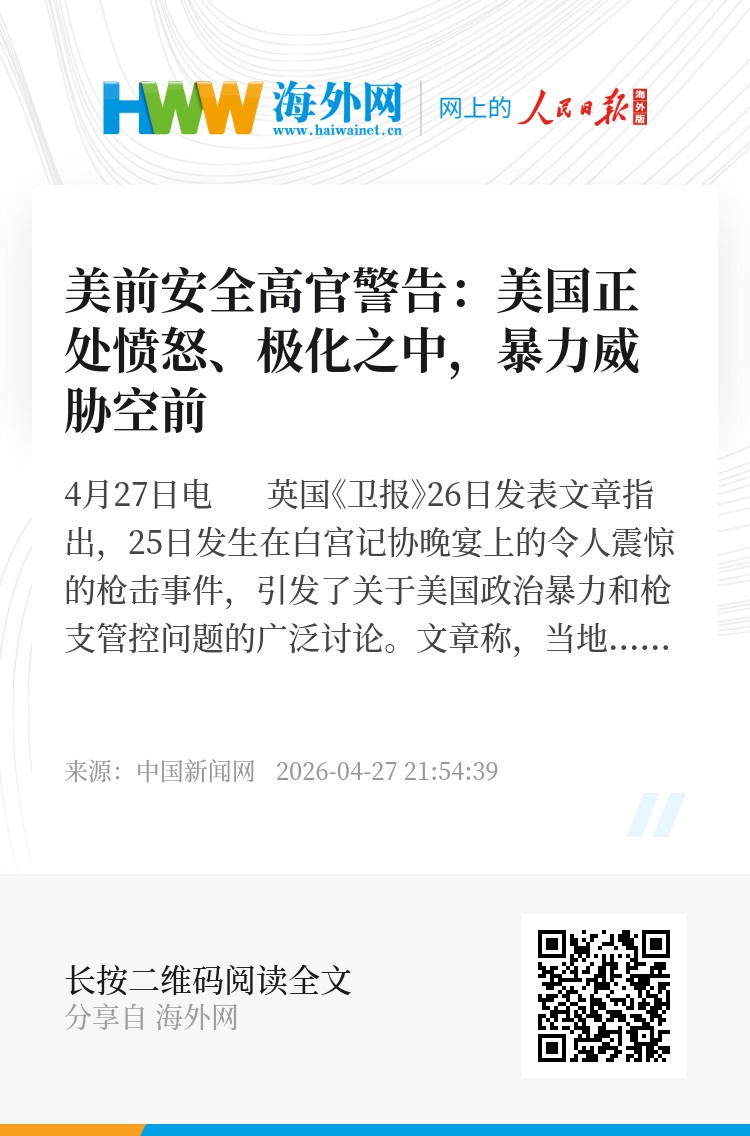 中新网4月27日电 英国《卫报》26日发表文章指出,25日发生在白宫记协晚宴上的令人震惊的枪击事件,引发了关于美国政治暴力和枪支管控问题的广泛讨论。