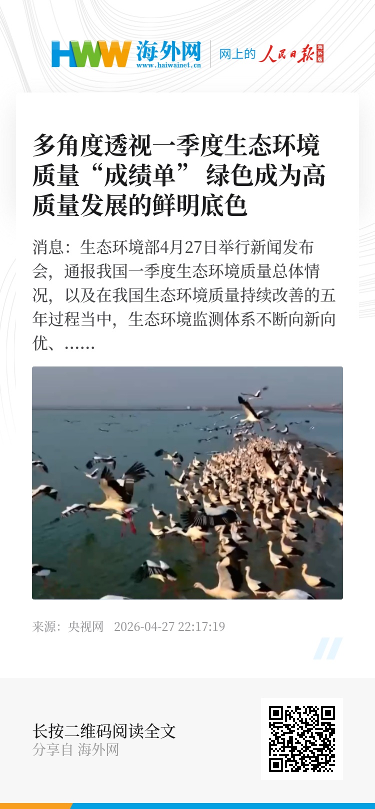 央视网消息:生态环境部4月27日举行新闻发布会,通报我国一季度生态环境质量总体情况,以及在我国生态环境质量持续改善的五年过程当中,生态环境监测体系不断向新向优、提质增效的基本情况。据了解,我国目前已建成全球规模最大、布局科学合理的生态环境监测网络,涵盖了空气、地表水、地下水、海洋、土壤、生态等各领域,初步具备对污染防治、生态保护与应对气候变化的全方位支撑能力。