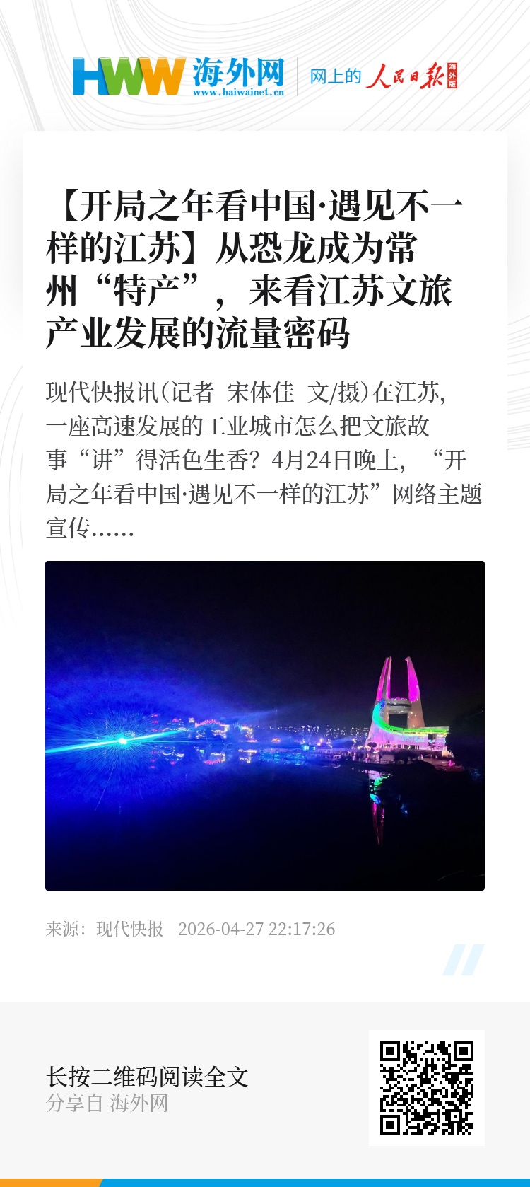 现代快报讯(记者 宋体佳 文/摄)在江苏,一座高速发展的工业城市怎么把文旅故事“讲”得活色生香?4月24日晚上,“开局之年看中国·遇见不一样的江苏”网络主题宣传活动调研团来到常州中华恐龙园。在这里,从“角角”到“酱板龙”,因“苏超”走红的恐龙“明星”,都被捧上台前与游客互动,成了“快乐经济”新的增长点。这也是江苏文旅产业蓬勃发展的生动注脚。