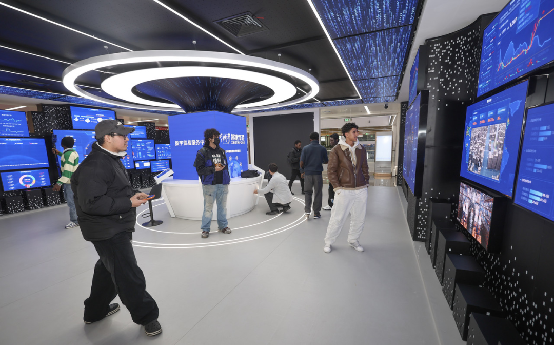 中外客商在义乌全球数贸中心观看数字大屏 图源:新华