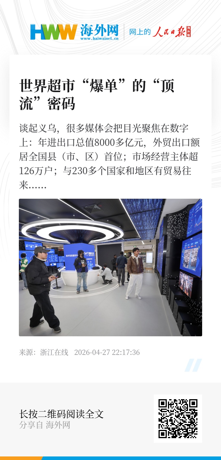 在这里,文化就是生产力,传统文化中的义利观、道德观被深度嵌入现实经济运行。比如去年一名义乌商户因客户操作失误,收到一笔“意外之财”——原本5.9万元的货款变成了13万元,商户没有片刻犹豫便联系上客户,将多收的7万多元如数退还,诚信经营的理念早已深深融入每个个体的心中;再比如前段时间,面对战火中的伊朗合作伙伴,义乌老板主动喊话“钱别转,你留着,希望你平安”。正是这种朴素而富有人情味的价值取向,让义乌小商品在全球竞争中牢牢赢得了客户信赖。