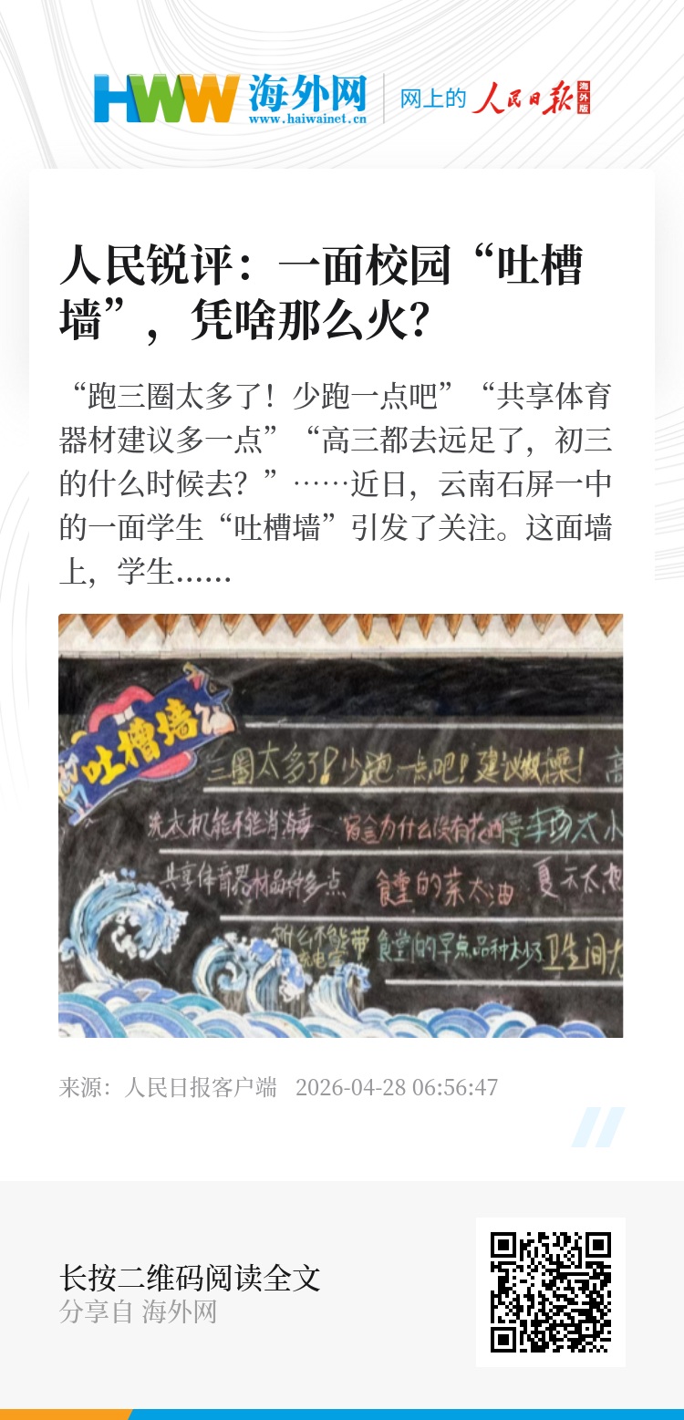 学生“吐槽墙”折射出一种值得深思的教育理念:学生的成长不是被动接受管理的过程,青少年群体有自己的独立思考、真实需求和表达愿望。当学生从喇叭中听到校长念到自己的建议,看到学校拿出具体举措时,教育的意义在这一刻变得具象:学生的声音值得被听见,情绪应当被关注,学生有权利对学校事务提出意见和建议。当学校愿意平等沟通,学生也会在被尊重中学会表达——这也是一种双向奔赴。