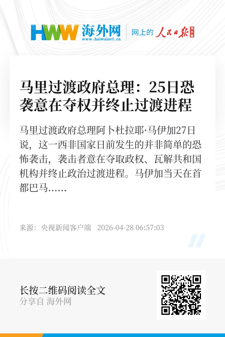 马里过渡政府总理阿卜杜拉耶·马伊加27日说,这一西非国家日前发生的并非简单的恐怖袭击,袭击者意在夺取政权、瓦解共和国机构并终止政治过渡进程。