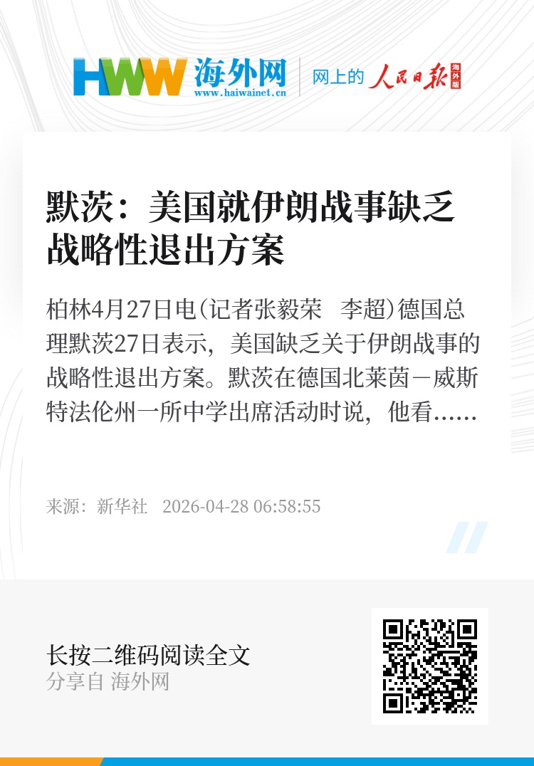 新华社柏林4月27日电(记者张毅荣 李超)德国总理默茨27日表示,美国缺乏关于伊朗战事的战略性退出方案。