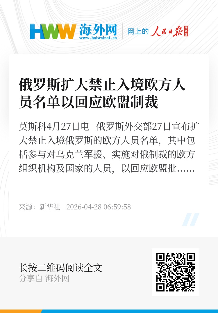 新华社莫斯科4月27日电 俄罗斯外交部27日宣布扩大禁止入境俄罗斯的欧方人员名单,其中包括参与对乌克兰军援、实施对俄制裁的欧方组织机构及国家的人员,以回应欧盟批准新一轮对俄制裁。