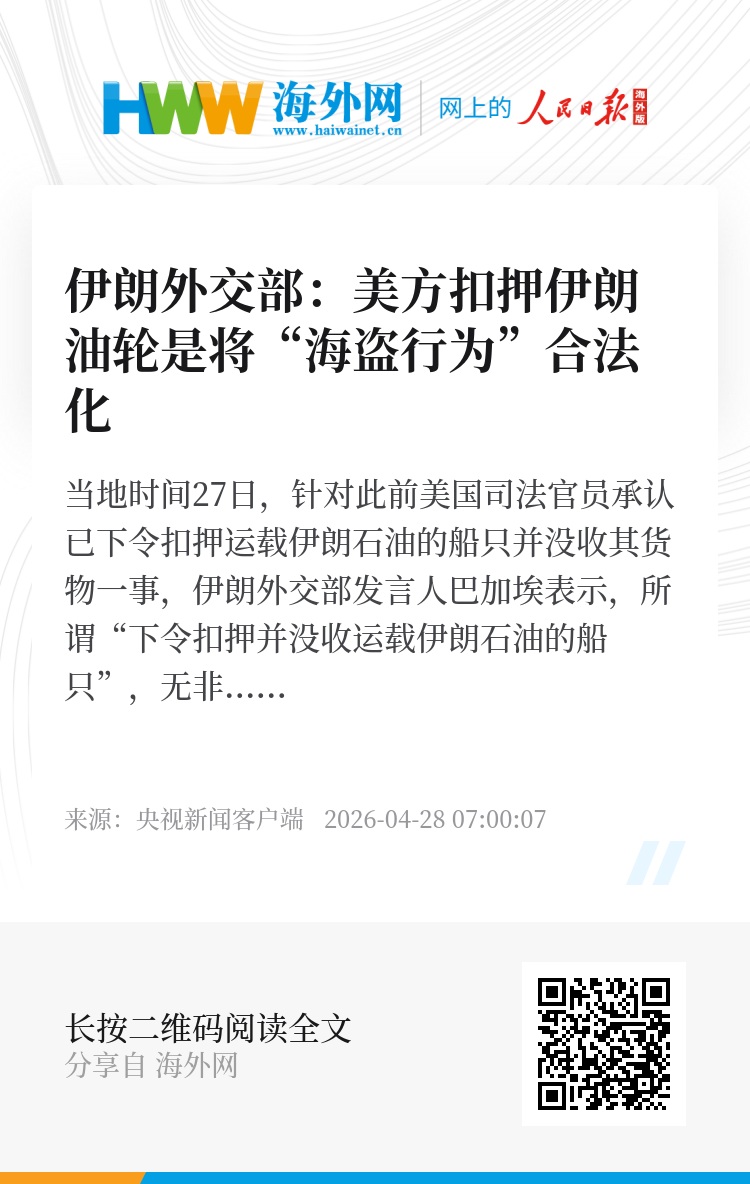当地时间27日,针对此前美国司法官员承认已下令扣押运载伊朗石油的船只并没收其货物一事,伊朗外交部发言人巴加埃表示,所谓“下令扣押并没收运载伊朗石油的船只”,无非是把海盗行为和在国际水域的武装掠夺正式合法化。