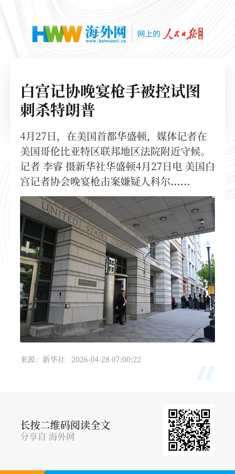 新华社华盛顿4月27日电 美国白宫记者协会晚宴枪击案嫌疑人科尔·艾伦27日在首都华盛顿首次出庭,被正式指控企图刺杀总统特朗普、跨州运输武器以及在暴力犯罪中使用枪支。