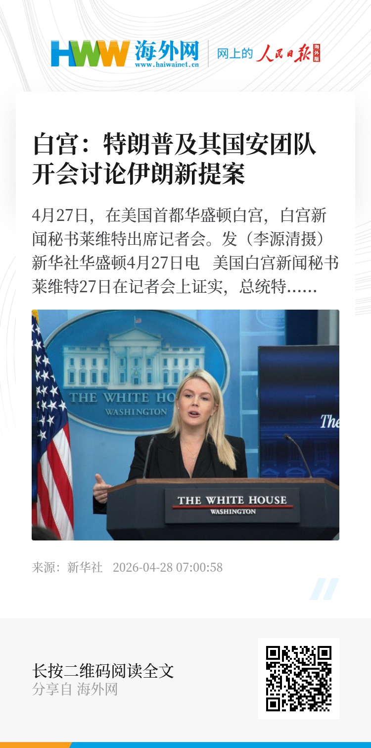 新华社华盛顿4月27日电 美国白宫新闻秘书莱维特27日在记者会上证实,总统特朗普及其国家安全团队当天开会讨论伊朗提出的谈判新方案。