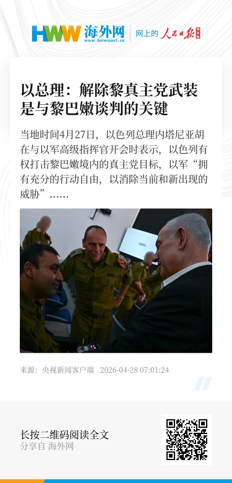 当地时间4月27日,以色列总理内塔尼亚胡在与以军高级指挥官开会时表示,以色列有权打击黎巴嫩境内的真主党目标,以军“拥有充分的行动自由,以消除当前和新出现的威胁”,这是“我们与美国和黎巴嫩政府达成的协议的一部分”。