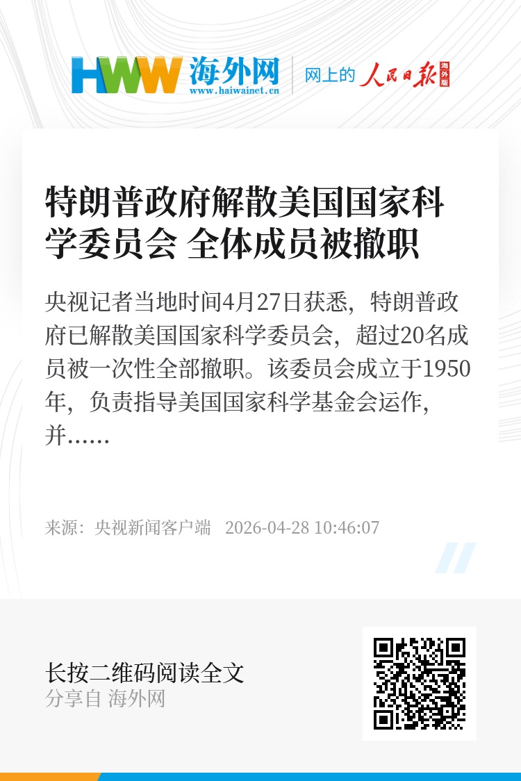 两名被解职成员表示,相关决定已于本月24日生效,但未给出具体理由。白宫方面则回应称,委员会的相关权限可能需要更新,并强调国家科学基金会工作将“持续进行、不受影响”。(央视记者 曹健)
