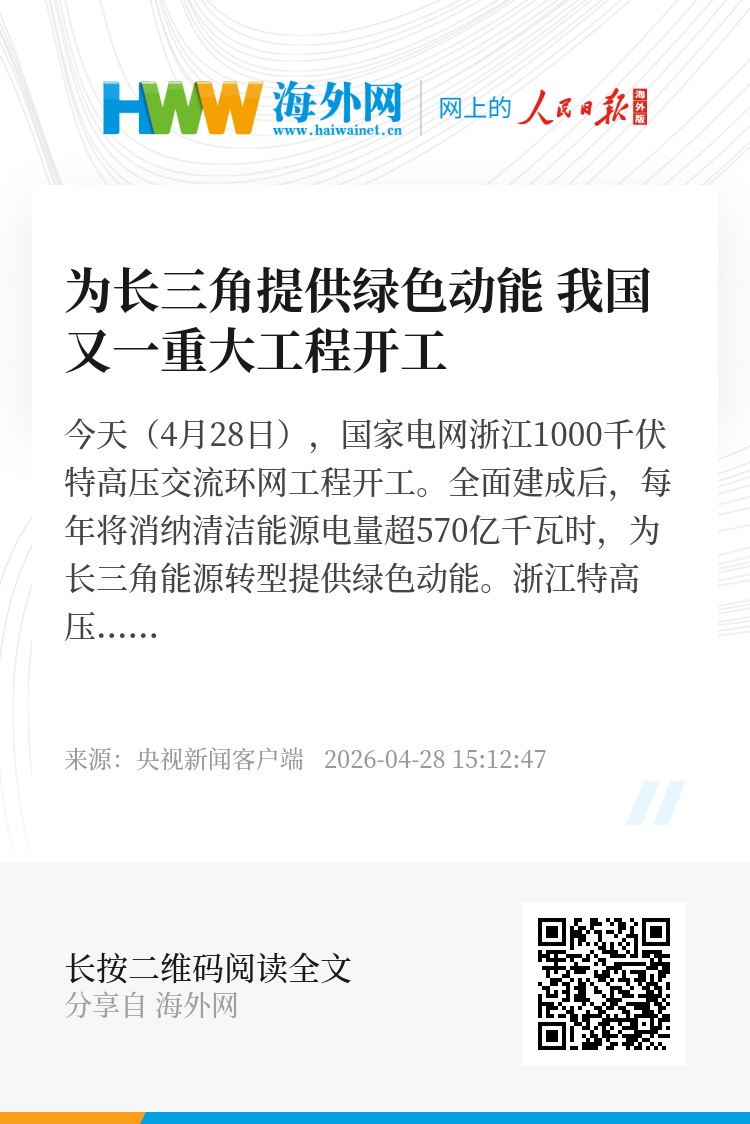 今天(4月28日),国家电网浙江1000千伏特高压交流环网工程开工。全面建成后,每年将消纳清洁能源电量超570亿千瓦时,为长三角能源转型提供绿色动能。