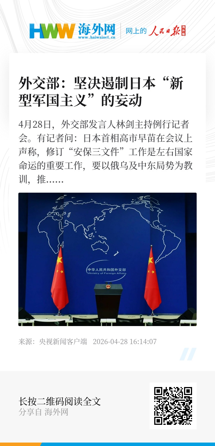 4月28日,外交部发言人林剑主持例行记者会。有记者问:日本首相高市早苗在会议上声称,修订“安保三文件”工作是左右国家命运的重要工作,要以俄乌及中东局势为教训,推进应对“新型作战方式”以及为长期战争做好准备,推进海上安保能力、网络安全和经济安全保障。请问发言人有何评论?