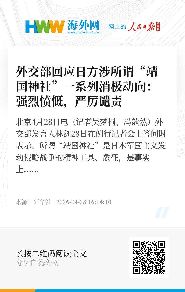 新华社北京4月28日电(记者吴梦桐、冯歆然)外交部发言人林剑28日在例行记者会上答问时表示,所谓“靖国神社”是日本军国主义发动侵略战争的精神工具、象征,是事实上的“战犯神社”。日方涉所谓“靖国神社”一系列的消极动向,公然严重践踏历史正义和人类良知,挑战二战胜利成果与战后国际秩序。中方对此强烈愤慨,严厉谴责。