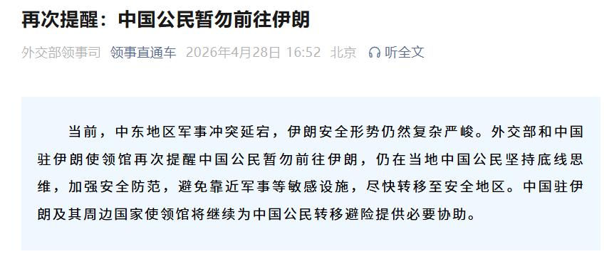 当前,中东地区军事冲突延宕,伊朗安全形势仍然复杂严峻。外交部和中国驻伊朗使领馆再次提醒中国公民暂勿前往伊朗,仍在当地中国公民坚持底线思维,加强安全防范,避免靠近军事等敏感设施,尽快转移至安全地区。中国驻伊朗及其周边国家使领馆将继续为中国公民转移避险提供必要协助。