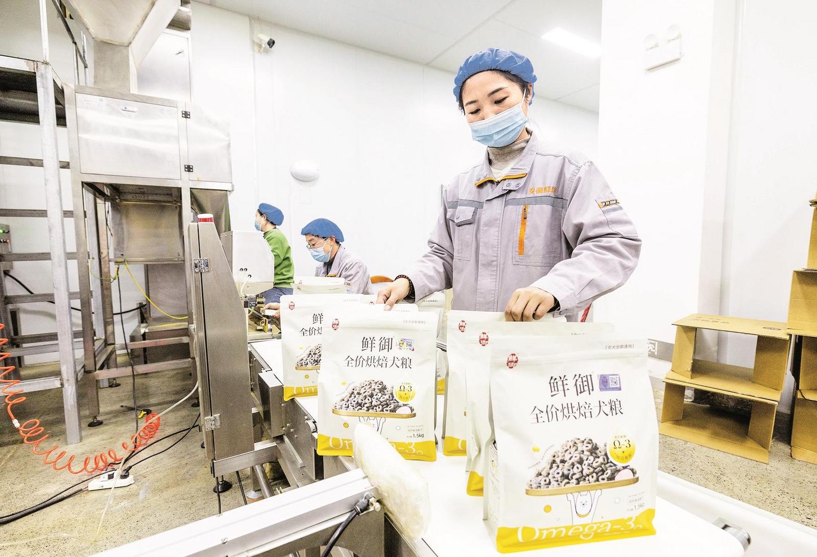 坐落在宿马园区的安徽鲜醇生物科技有限公司员工在宠物功能性烘焙粮生产线上作业。