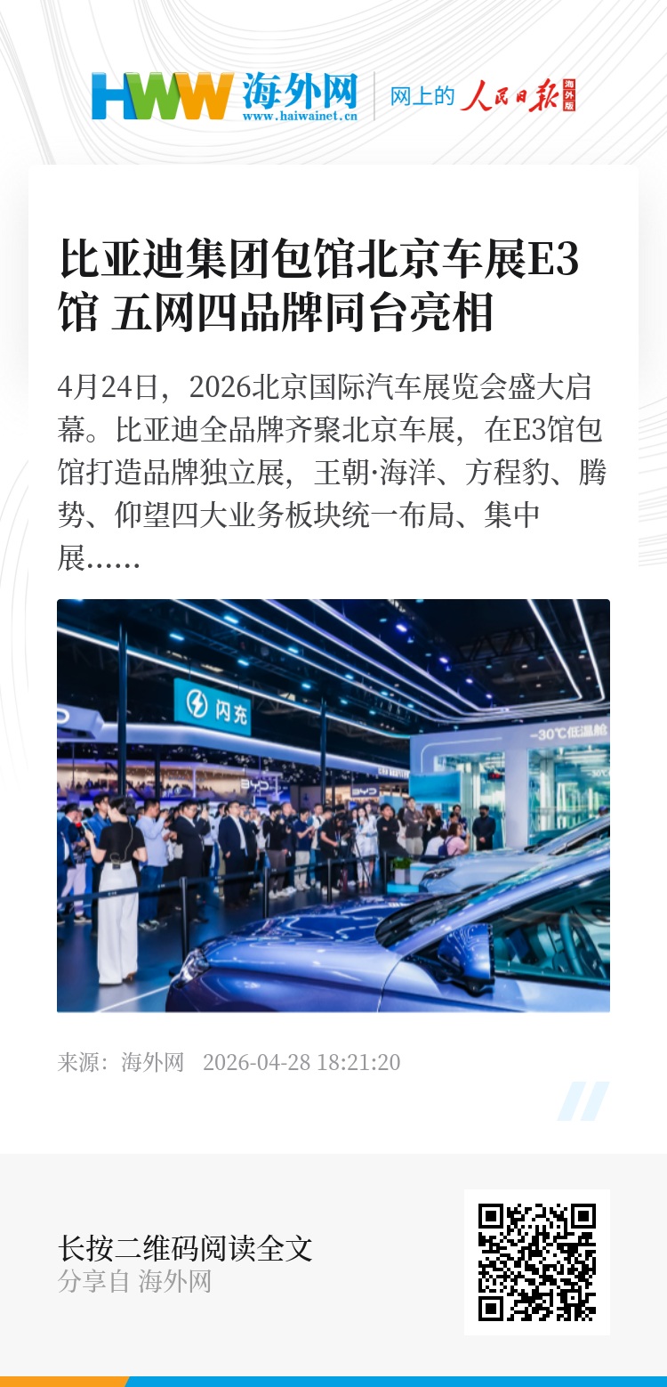 4月24日,2026北京国际汽车展览会盛大启幕。比亚迪全品牌齐聚北京车展,在E3馆包馆打造品牌独立展,王朝·海洋、方程豹、腾势、仰望四大业务板块统一布局、集中展示,同时专门设置“天神之眼”和闪充技术专区,彰显比亚迪在智能辅助驾驶与电动化领域的前沿技术成果。