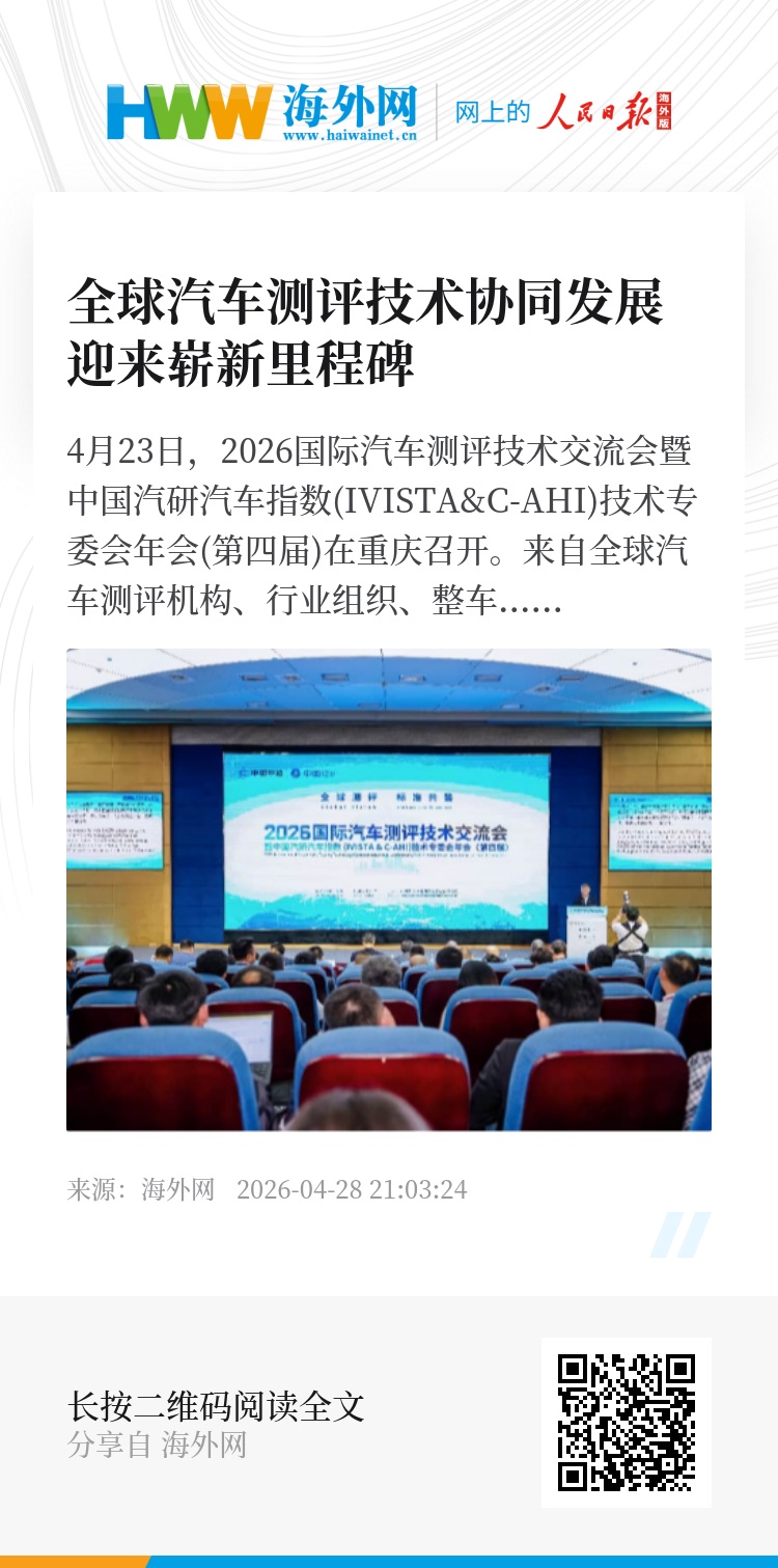 4月23日,2026国际汽车测评技术交流会暨中国汽研汽车指数(IVISTA&C-AHI)技术专委会年会(第四届)在重庆召开。来自全球汽车测评机构、行业组织、整车企业及科研院所的代表齐聚一堂,围绕测评技术革新、国际标准协同、中国汽车全球化等核心议题开展深入研讨。